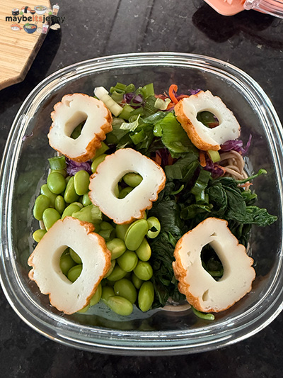 Well one day, I saw a recipe for soba salad with it’s own ginger soy dressing so I did it. I don’t like a lot of veggies raw but wanted the colors so I quick pickled red cabbage and carrots – quick blanched spinach, etc. I add some fish cake as a protein/meat for the meal and I haven’t turned back since. I’ve been eating this for lunch at work for 2 weeks now and I still haven’t grown tired of it. I love all things savory and noodles so this really works out for me. And you can easily play up which veggies to use as toppings which keeps things fresh. Here’s a quick write-up of what I do. The dressing is the most important part of this recipe.