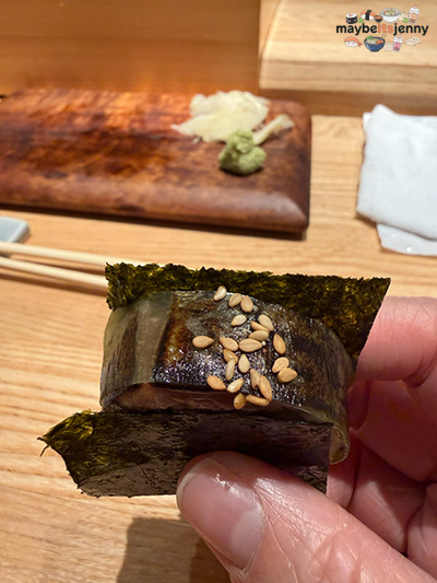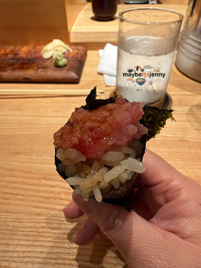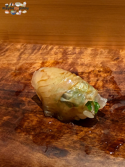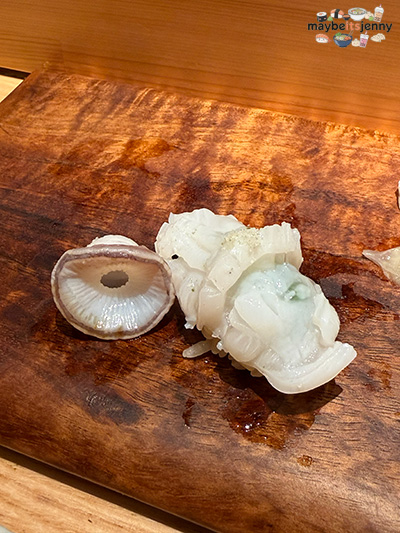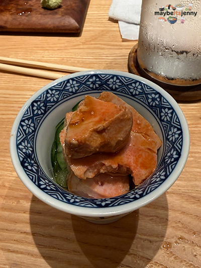 This was an order after the omakase was complete. They don’t serve it up with ponzu sauce but hey, they way they make it is much better. They serve it with super thin slices of cucumber which offers a nice crunchy fresh taste contrasting with the rich creamy liver. Yum!